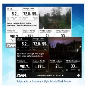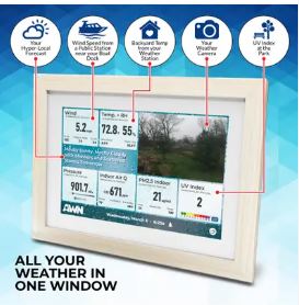 תצוגה: המכשיר כולל מסך LCD צבעוני ומלא חיים המציג נתוני מזג אוויר נוכחיים, תחזית מקומית ותמונה סטטית אופציונלית ממצלמת מזג האוויר שלך. קישוריות: הוא מתחבר לרשת ה-Wi-Fi הביתית שלך ומאפשר לך לצפות בנתונים מרחוק דרך חשבון AWN שלך באתר או באפליקציה. מקורות נתונים: אין צורך בתחנת מזג אוויר פרטית; המכשיר יכול להציג נתונים מתחנות ציבוריות של AWN (יותר מ-180 אלף תחנות, כולל NOAA) או מכל תחנה פרטית של Ambient Weather שברשותך. התאמה אישית: באפשרותך להתאים אישית את תצוגת הנתונים באמצעות ארבע תבניות מעוצבות מראש, לבחור בין מצב אור לחושך, וליהנות מרקע דינמי המשתנה בהתאם לתנאי מזג האוויר. שימושים: המכשיר מתאים למגוון שימושים, כגון ניטור תנאים בגינה, בחוף הים האהוב עליך, בבית הספר המקומי או באתר בנייה.