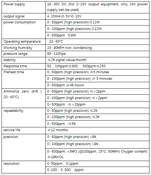 The span of this ammonia range is 100ppm, which is expressed by a 16mA current signal, 100ppm/16mA=6.25ppm/mA, that is, a current of 1mA represents an ammonia concentration change of 6.25ppm, and the measured value is 12mA 4mA=8mA, 8 mA*6.25ppm/mA =50ppm, the current ammonia concentration is 50ppm.